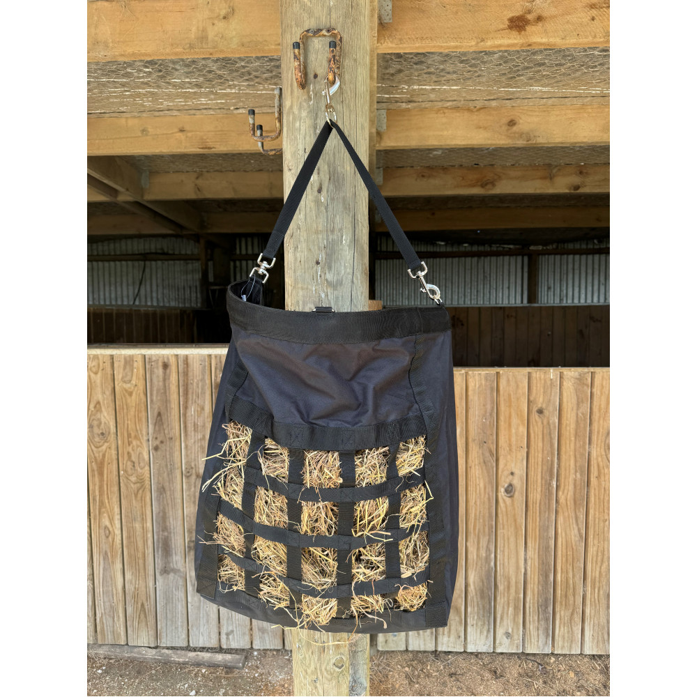 This durable double-sided feeder is designed to reduce waste with its 6x6 cm feeding holes. Made from tough polyester, it features an easy-fill top for hassle-free refills. The clips ensure a secure closure, and the adjustable strap allows you to hang it from any rail or stable fitting, making feeding simpler and more convenient. Enjoy a cleaner feeding area while providing your horse with easy access to hay!