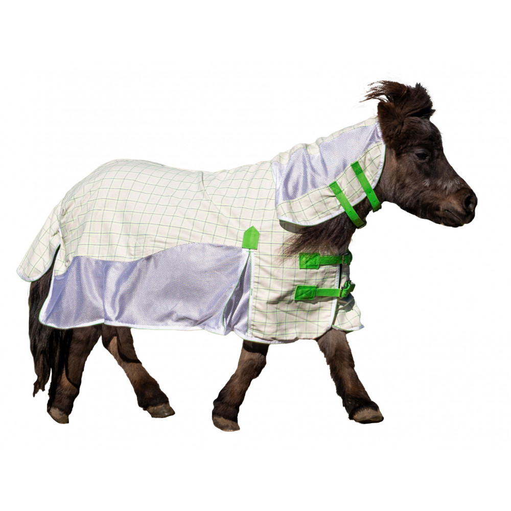 Stand out style meets all day comfort! This cotton rich ripstop rug with mesh sides is designed for maximum airflow to keep your mini cool and comfy. Features Velcro & double front buckles for a secure fit, Shoulder gussets for freedom of movement, Removable leg straps with new improved clips, Oversized tail flap and Satin lining at the neck, chest & tail to help prevent rubbing.