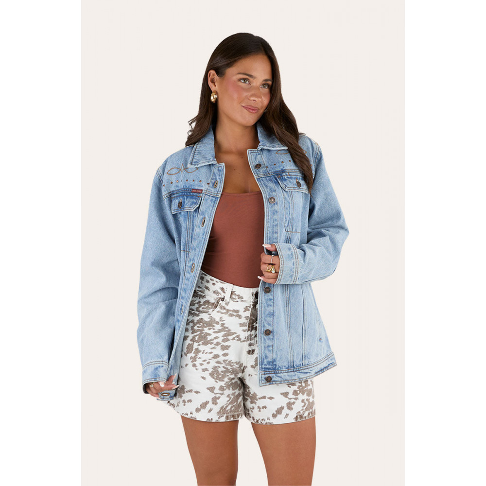 Make a statement and turn up the cowgirl energy with the Hoedown Women’s Denim Jacket, the ultimate cowgirl inspired oversized denim jacket. Perfect for festivals, country nights, or casual weekends, this standout jacket combines western style and premium detailing for a look that’s bold, playful, and uniquely western.