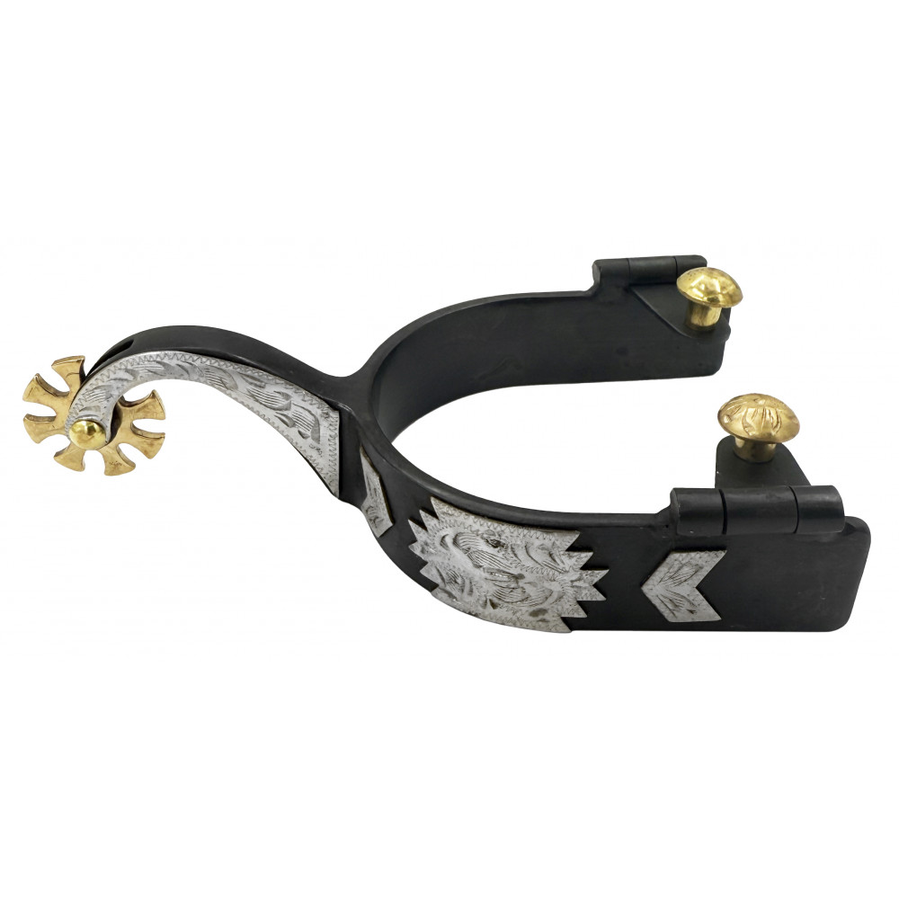 Built for everyday riding with show-ring style, these Texas spurs feature an antique-black steel body highlighted by overlays. A gently curved shank with a small multi point rowel gives a precise cue, while button posts take standard western spur straps for a secure fit. Durable, balanced, and comfortable for long hours in the saddle.