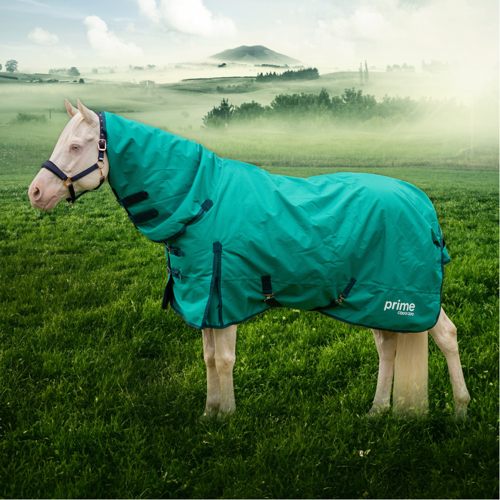 New brand for winter 2024. Made from waterproof yet breathable 1200 denier ripstop material. Fully lined with 200g polyfill. Featuring shoulder gussets, cross surcingles, double front straps with buckles, and removeable, adjustable leg straps. Integrated neck cover has touch close closures. Green