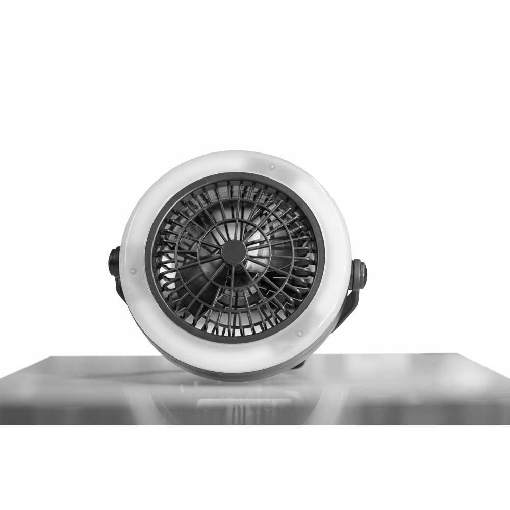 LED Camping Lantern with Fan. Super-thin size design for easy carrying outdoors. Air-outlet 3d design reduces noise and energy consumption. Water resistance: IPX5, Bulb: 12x SMD LED's 2835(200 lumen), Power output: 1.2W, Material: ABS, Battery: 3*AA(excluded), Upto 3.5 hours fan run time.