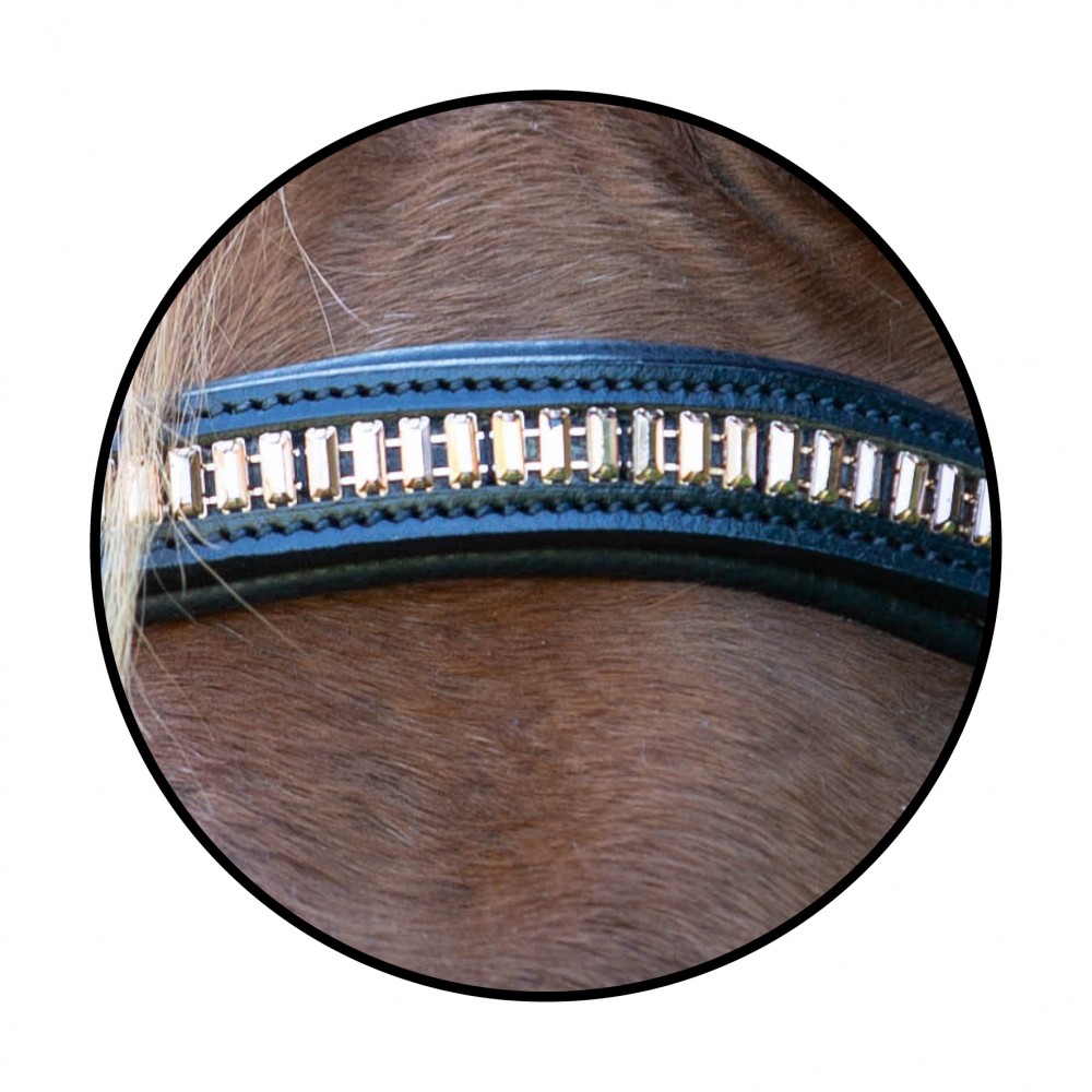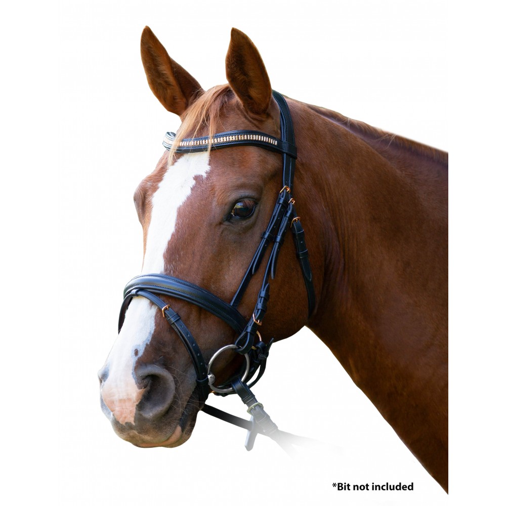 The Enzo Rose Bridle features a stunning padded wave browband with rose gold detailing. An extra wide comfort headpiece, rose gold hardware, padded noseband for extra comfort and a removable flash. Includes web reins.