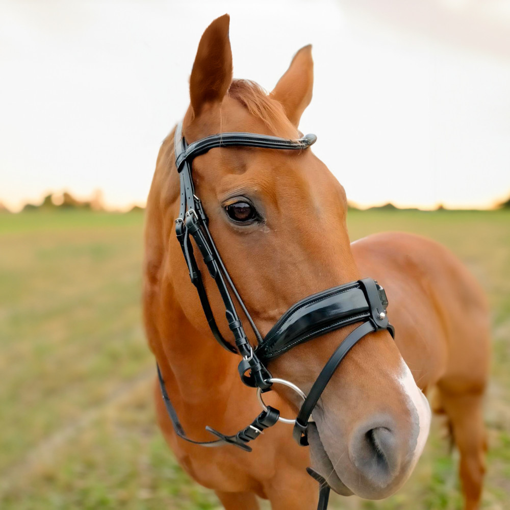 The Enzo Lugo bridle is a bold yet classic style. With a padded, wide, patent nose band with a fully removable flash, and crank closure. Also a flattering, padded, curved brow band. Complete with web reins. Bit not included.
