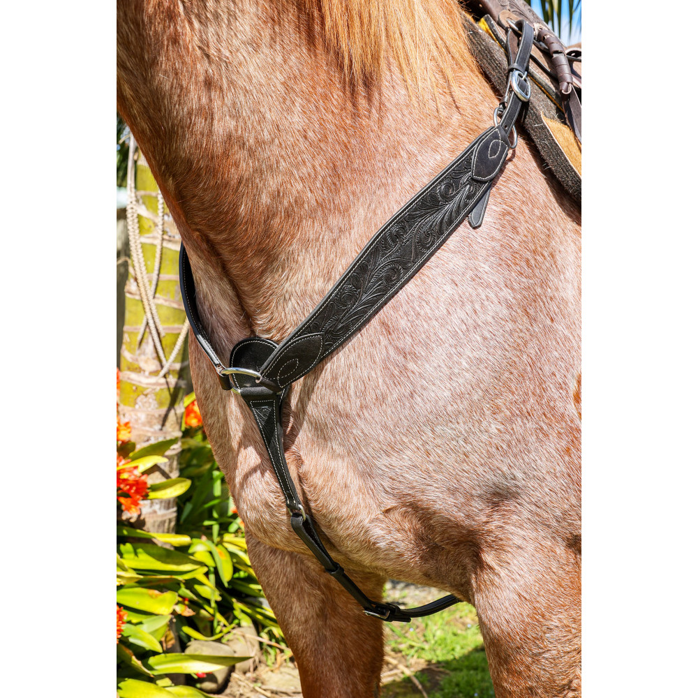 Quality dark brown leather western breastplate with tooling along the sides with white contrasting stitching. Has silver buckles and rings. Matches the Wade Western saddle and Bridle. One Size.