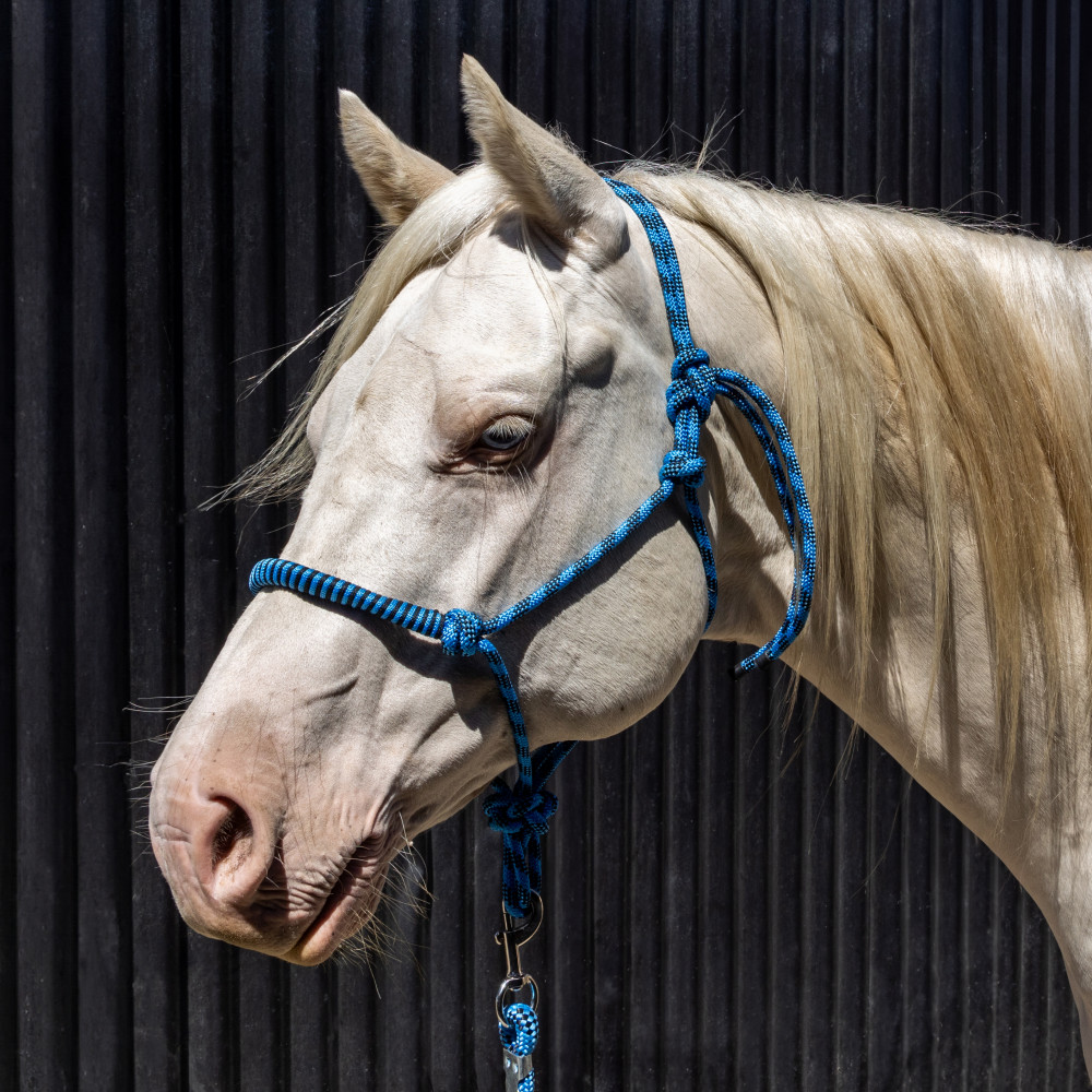 Origin Kaye Rope Halter is 2 tone blue and navy rope with a braided nose band. Complete with matching, removable lead rope. One size - cob/full.