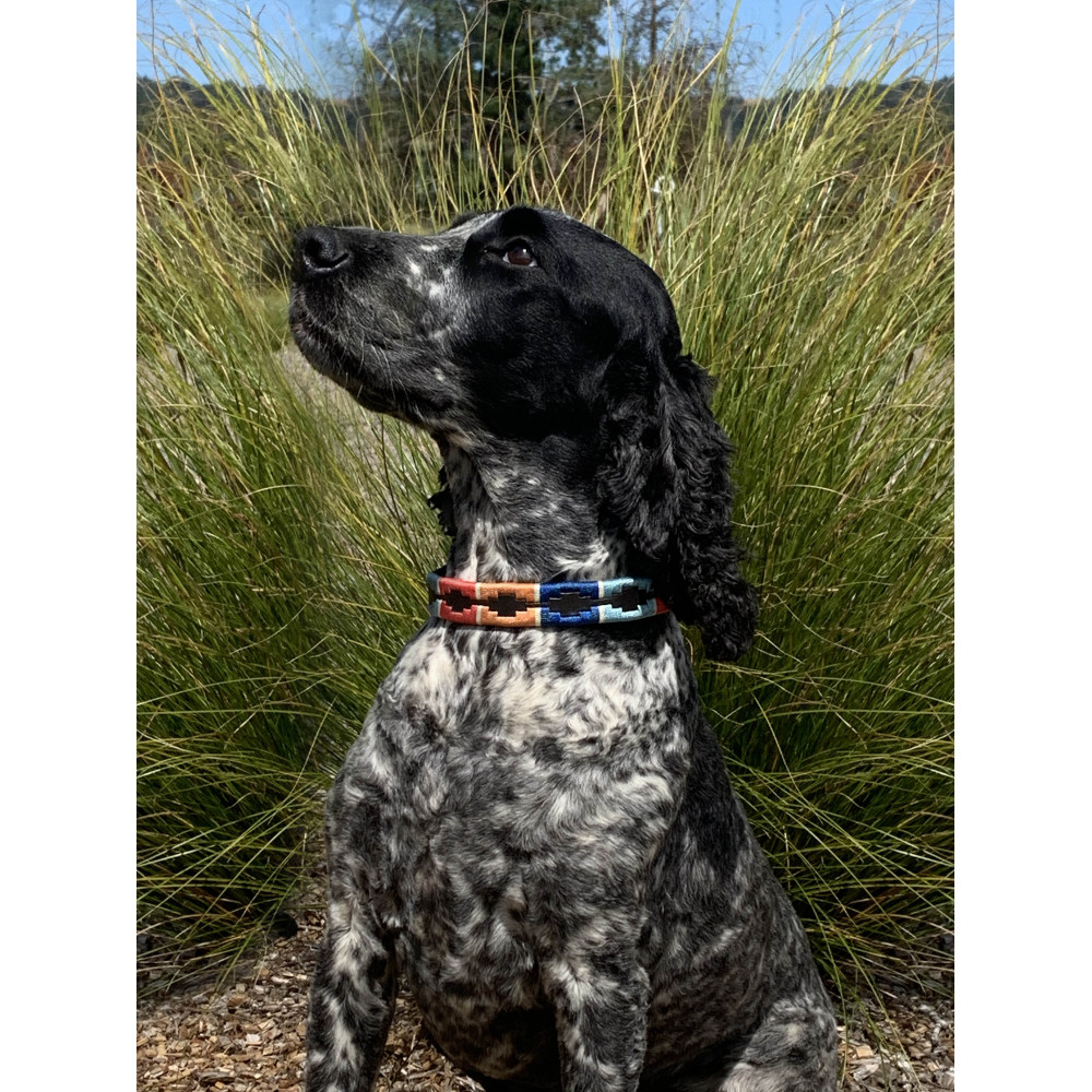 Brown leather dog collar, with brass fittings. Teal/Red/Orange/Blue stitching.