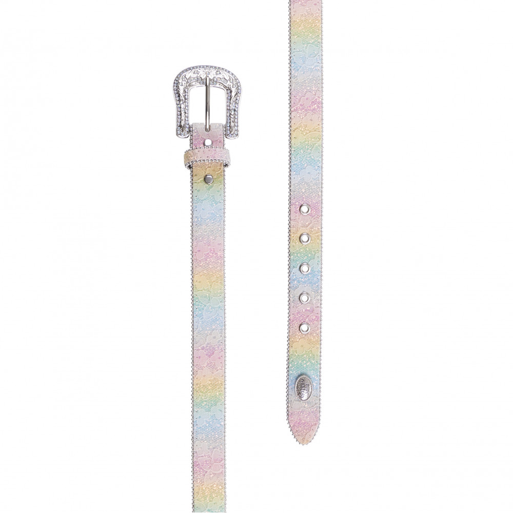 Coloured belt with lace overlay, beaded edge, and silver hardware. With a Pure Western concho.
