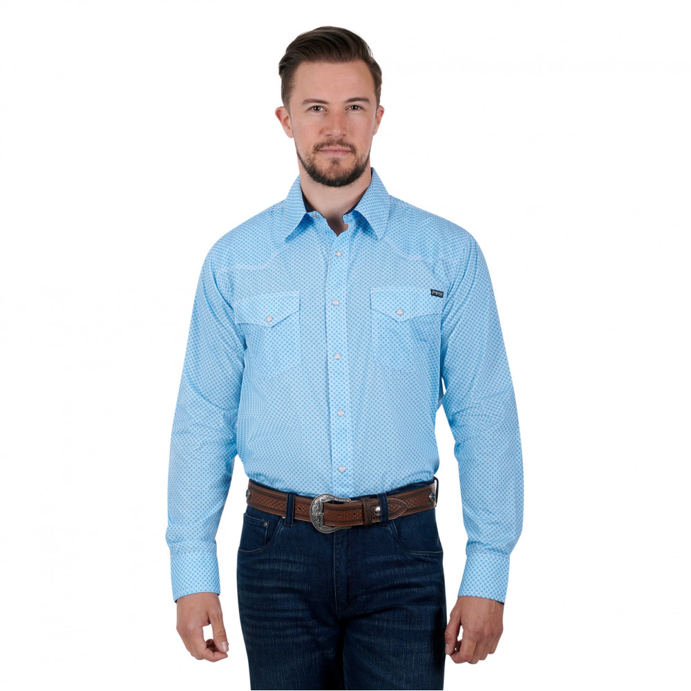 Classic western styling with geometric print, snap closure, western chest pockets, one with pen holder, western front and back yokes, contrast trim on inside collar stand, triple needle stitch detail on yokes and armholes and Pure Western back neck embroidery. 100% Cotton Print. Blue/Tan.