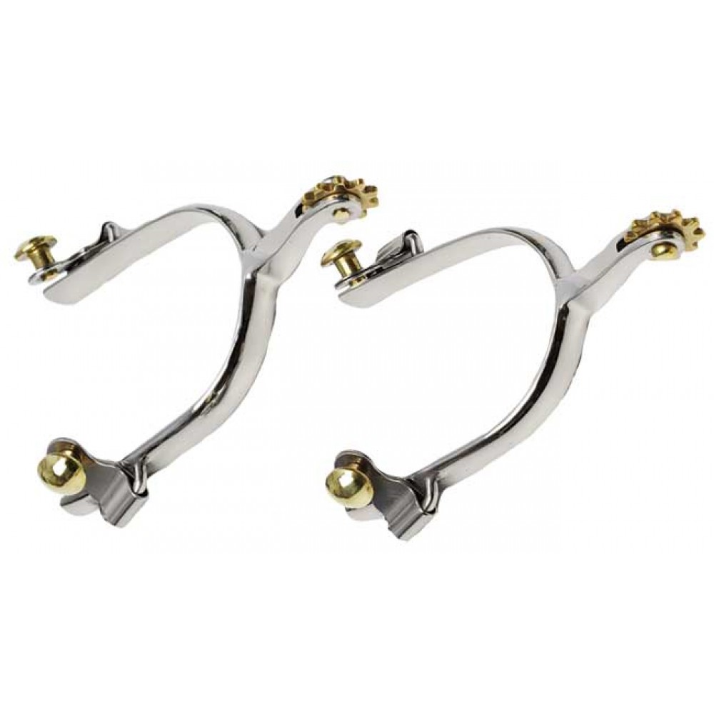 These stainless steel spurs are popular for use in western riding disciplines and come with brass rowels and buttons.